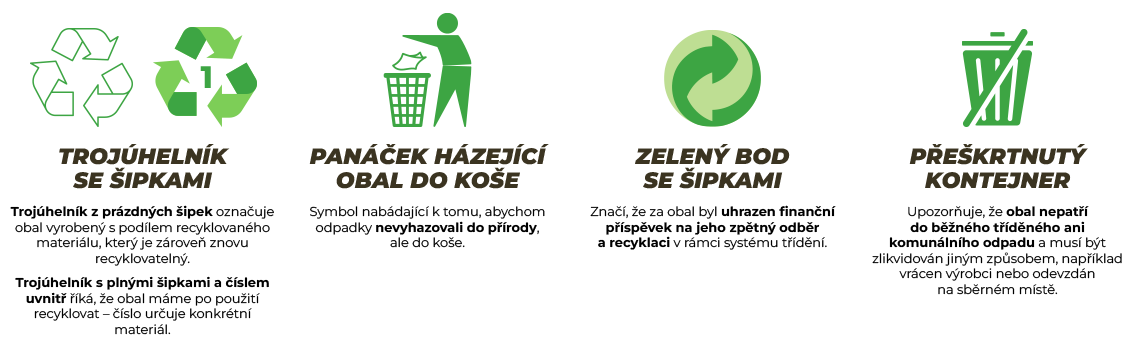 Na obalech se nejčastěji objevují recyklační symboly materiálů, trojúhelník se šipkami, zelený bod, panáček s košem nebo přeškrtnutý kontejner, které informují o složení obalu a způsobu jeho likvidace.